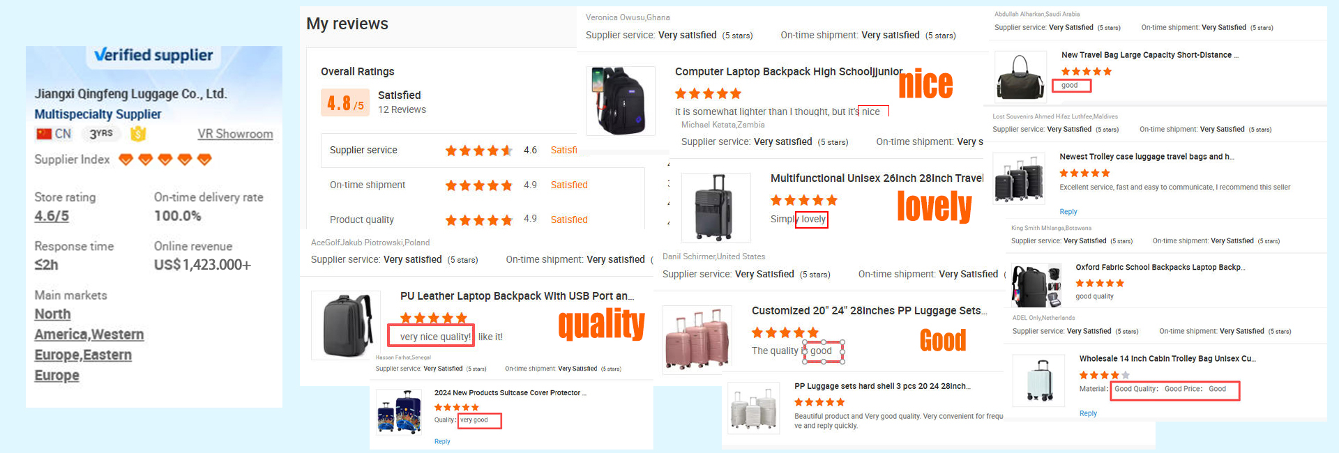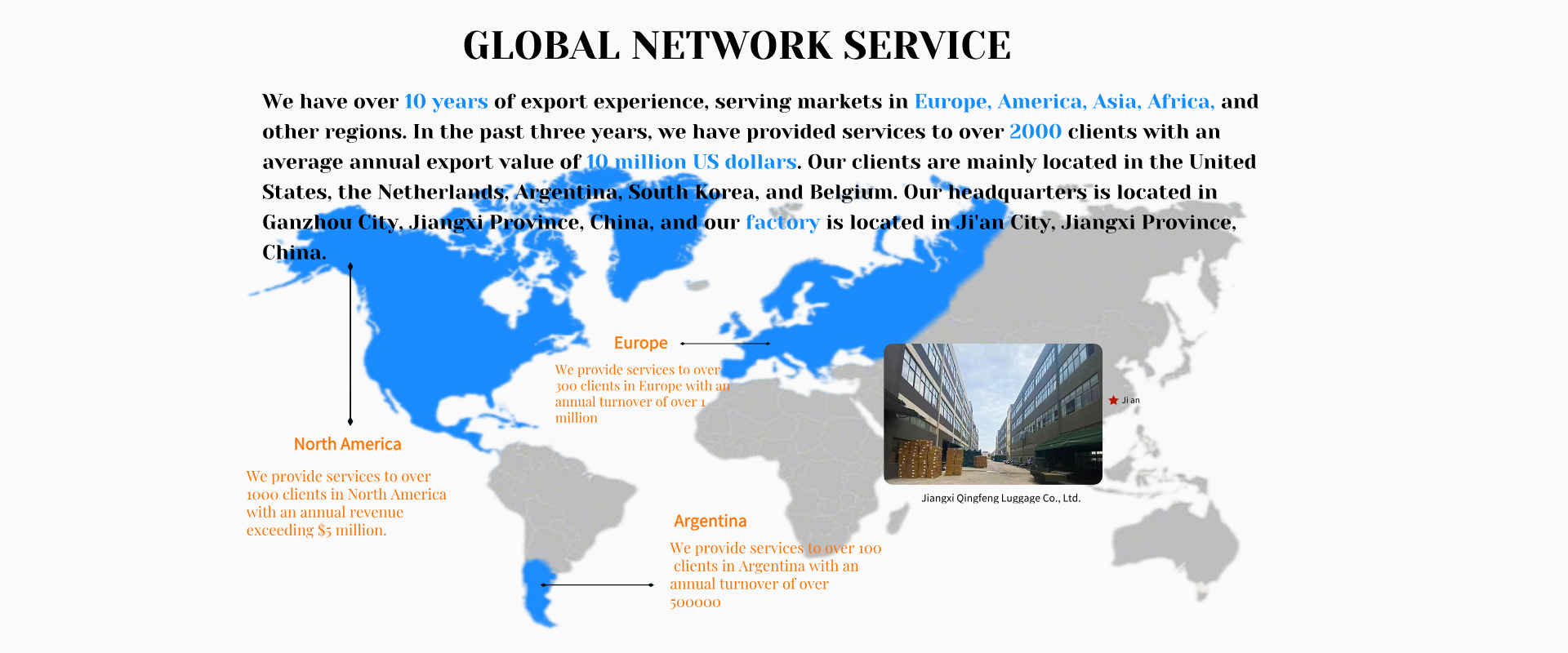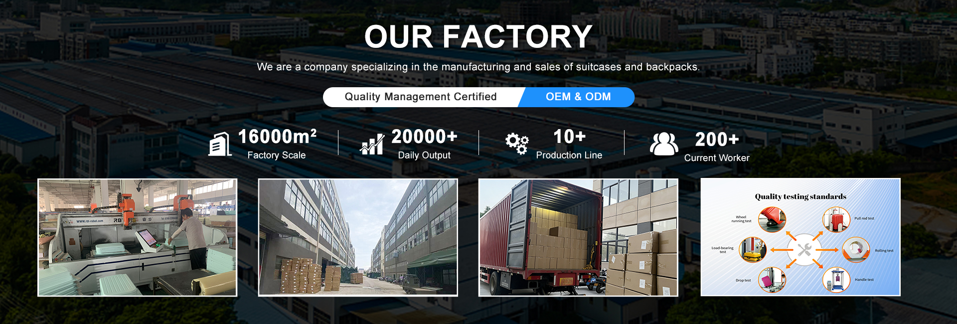 Jiangxi Qingfeng Sacages Co., Ltd. a plusQue 10 ans d'expérience de production dedansL'industrie des bagages, nous nous sommes spécialisés dans la vente ABS, PP,PC, bagages souples et toutes sortes de sacs à dos, fournirServices d'approvisionnement à guichet unique, nous avonsÉquipe de conception professionnelle, équipe de QC et hautePréventes d'efficacité et équipe de service après-vente,Fournissez le prix concurrentiel et 12 heures de service efficaceSoutien à nos clients.Notre usine couvre une superficie de 16 000 mètres carrés; nous avons3 machines d'extrusion de feuille d'ensembles avec une capacité de production quotidienneDe 20,000 pcs, 10 ensembles blister machines, 2 ensembles machines de découpe,Et 7 lignes de production, avec une capacité de production quotidienne de 8,000 pcs.Notre société adhère au point de départ de rencontrer des clientsLes exigences en matière de qualité des produits et le principed'amélioration continueQualité du produit, bâton à la gestion de la qualité stricteFournir une qualité de produit stable, support de livraison rapide;Nous fournissons tout le genre de services d'OEM et d'ODM pour nos clients, espérantQue grâce à nos connaissances professionnelles et à nos efforts inlassables, nous pouvonsFournissez la personnalisation efficace de produit, coûts raisonnables et réduisez aprèsLes coûts de vente des marques émergentes.